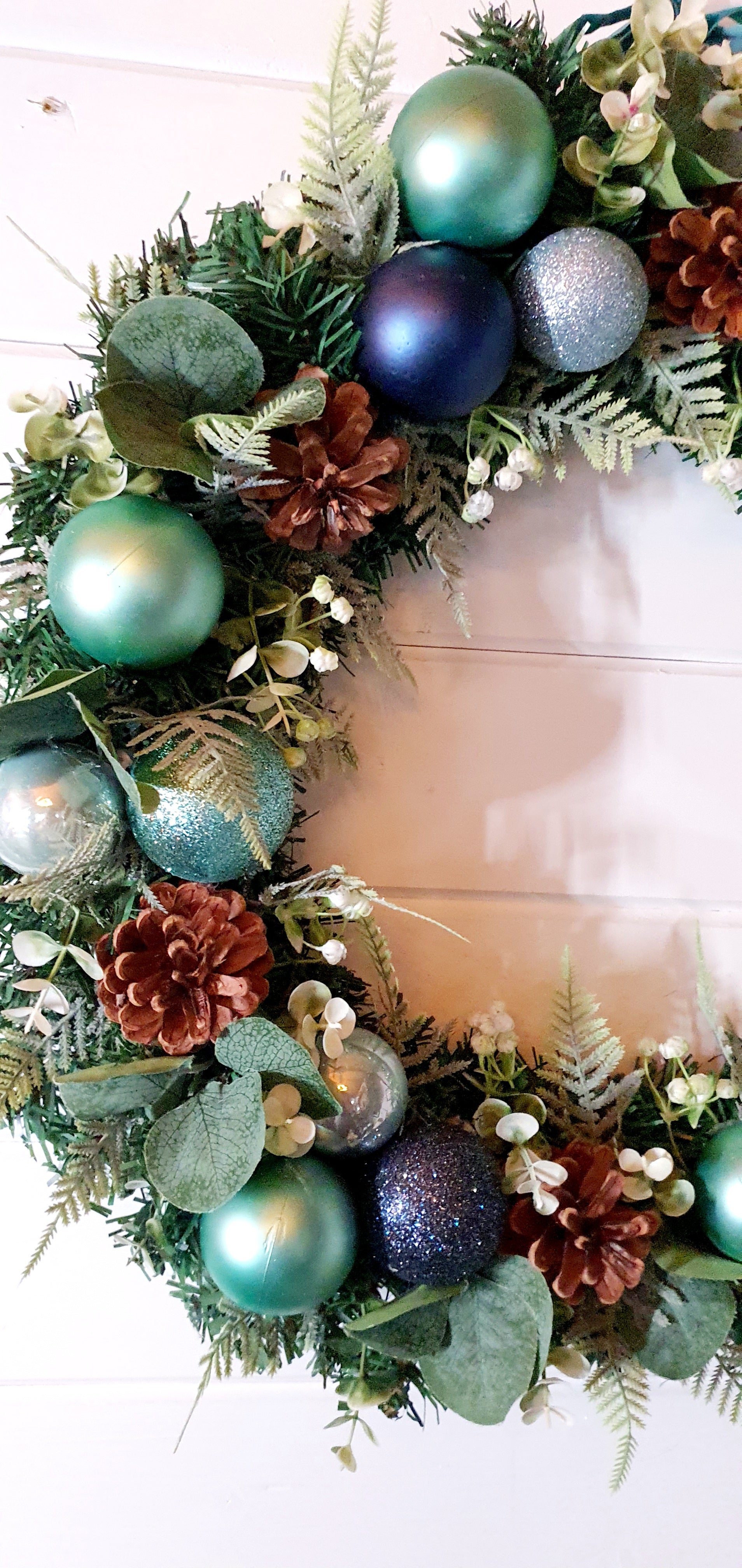 Add festive charm to your home with our Colourful Bauble Wreaths. Made with eucalyptus, complimentary coloured baubles, pine cones, and frosted ferns, this 45cm wreath will brighten up any room. Perfect for your home.