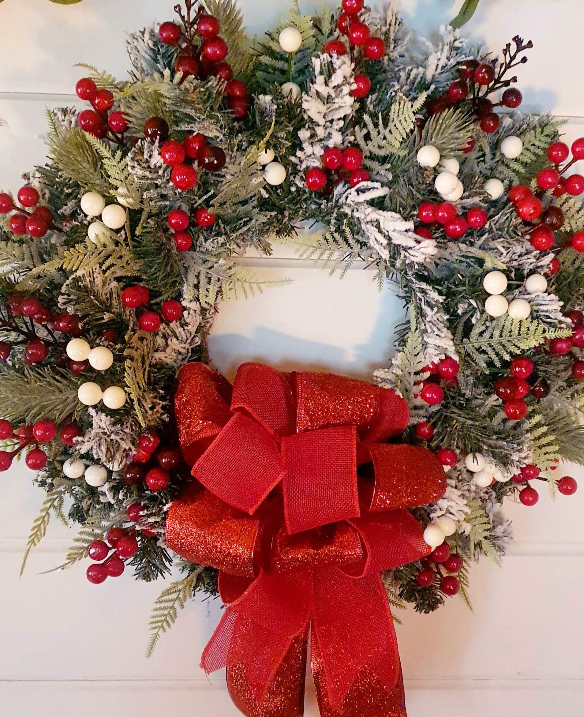 Frosted Red Ribbon and Berries Wreath. Adorned with a vibrant red ribbon and a variety of berries, this wreath is perfect for bringing warmth and cheer to any room.