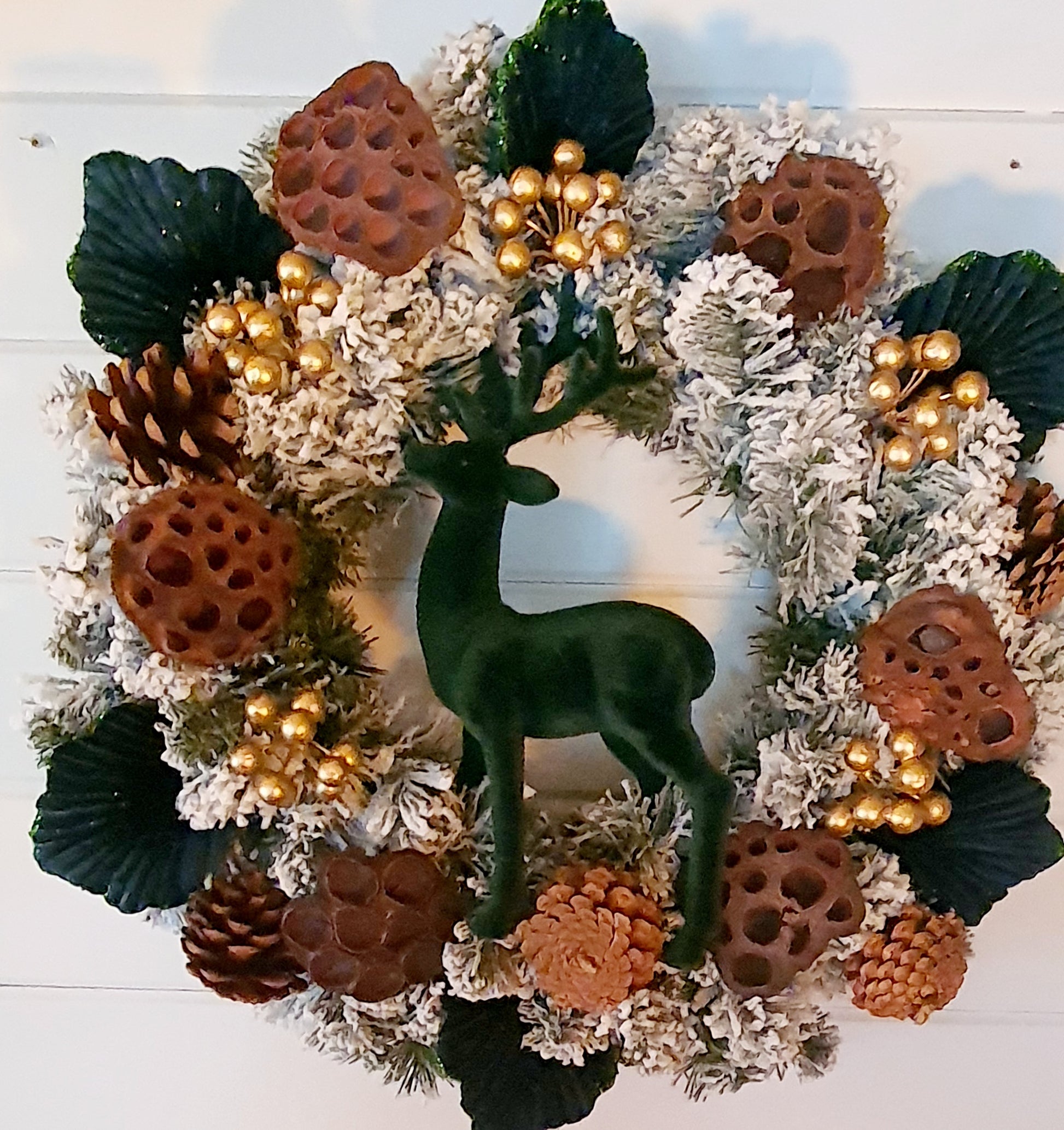 Elegant Green Stag with Gold Accents Wreath. The beautiful green stag, gold berries, pine cones, and lotus heads create a unique frosted design. Measuring 45cm, this wreath will add a touch of sophistication to any door.
