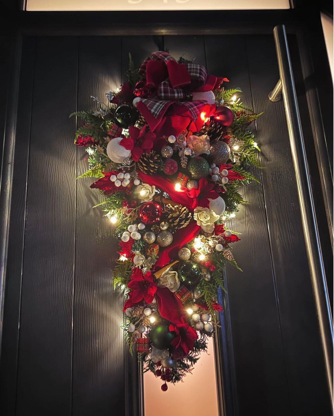 Elevate your holiday decoration with Red Ribbons - a festive swag adorned with lush greenery, vibrant red ribbons, twinkling fairy lights, and sparkling baubles. Swap out your traditional wreath for this eye-catching alternative.