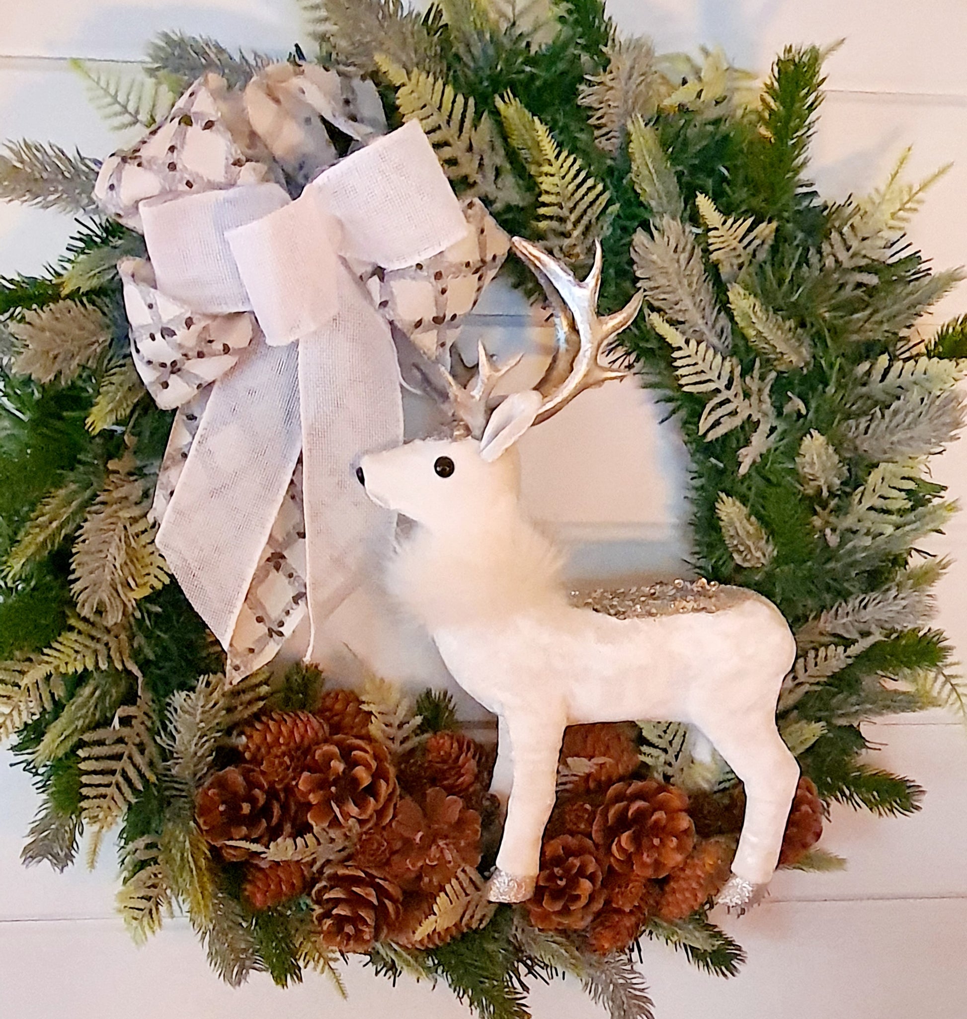 White Woodland Reindeer Wreath - 45cm. Featuring a woodland white reindeer, pine cones, frosted ferns and greenery, and a beautiful ribbon, this wreath brings a touch of nature to your home. Crafted with attention to detail, it's the perfect addition to any winter wonderland.